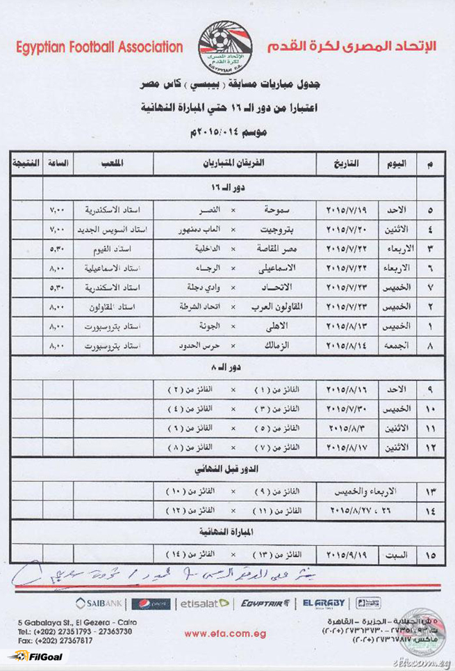 أعلن الاتحاد المصري لكرة القدم جدول مباريات بطولة كأس مصر بداية من دور ال`16 , وحتى المباراة النهائية.