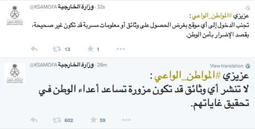 ونشرت الوزارة عبر حسابها على “تويتر”، “عزيزي المواطن الواعي تجنب الدخول إلى أي موقع بغرض الحصول على وثائق أو معلومات مسربة قد تكون غير صحيحة، بقصد الإضرار بأمن الوطن”.