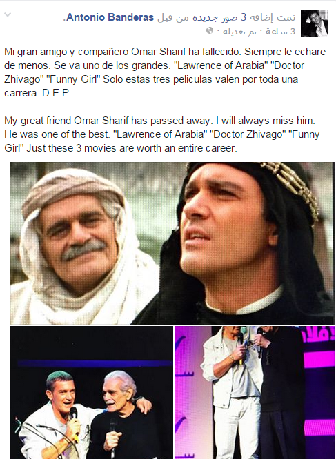 نعي النجم الاسباني انطونيو بانديراس علي صفحته الرسميه علي الفيس بوك الفنان العالمي عمر الشريف مؤكدا انه صديق كبير وسيفتقده كيثرا وان ما قدمه عمر الشريف وإن كان 3 أفلام فقط فانها تعتبر أثمن من حياه مهنية كاملة