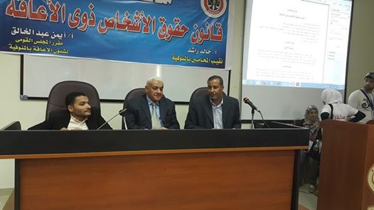 التقي مصطفي بيومي سكرتير عام مساعد محافظة المنوفية مناقشة مشروع قانون حقوق ذوي الاعاقة وذلك بقاعة الاجتماعات بمبني نقابة المحامين حضره كلا من مقرر المجلس القومي لشئون الاعاقة بالمنوفية و أمين عام نقابة المحاميين بالمنوفية ونائب رئيس مجلس مدينة شبين الكوم وممثل عن الشئون الاجتماعية وادارة شئون التأهيل.