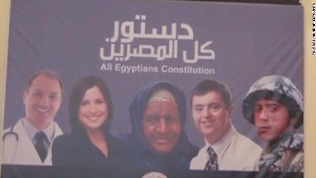 ويظهر في الصورة خمسة أشخاص، بينهم ثلاثة أجانب، ومصحوبة بعبارة، بها خطأ إملائي، إذ جاء فيها “دستور كل المصرين،” بدلاً من “المصريين.”