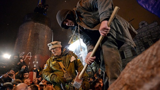 وتركزت الحملة في البداية على إزالة تماثيل للزعيم الشيوعي فلاديمير لينين في العديد من المدن الأوكرانية، إلا أنها شملت بعد ذلك تماثيل أقيمت تكريما للقوات السوفيتية التي طردت القوات النازية من أراضي البلاد. ودعا القوميون المتطرفون الى حظر الحزب الشيوعي في البلاد وأيضا حزب الأقاليم الذي كان يترأسه يانوكوفيتش، وذلك بحجة اعتباره مرتبطا بموسكو. هذا وأعلن روسلان كوشولينسكي نائب رئيس البرلمان الأوكراني اليوم  الثلاثاء عن إزالة النجمة الحمراء التي كانت سابقا منصوبة فوق مبنى مجلس الرادا، باعتبارها رمزا للاتحاد السوفيتي.