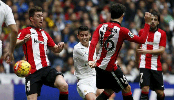 وأجاد دفاع بلباو في التصدي لمحاولات بنزيمة ورونالدو والكولومبي جيمس رودريجيز في الدقائق التالية.