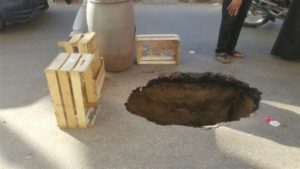 نحن نتحدث عن ” جريمة ” ذات علامة مميزة ومظهر واحد متشابه في كل الحالات : نفس الحفرة . نفس الدائرة . حفرة دائرية منتظمة .. كأنها محفورة بشنيور او بريمة .. تحدث فجأة دون أن يعرف أحد من حفرها في الارض وخصوصا في منتصف الطريق العام !! بدليل انه لا توجد حالة انهيار ارضي واحدة ثبت ان وراءها اهمال بشري من أي نوع !!