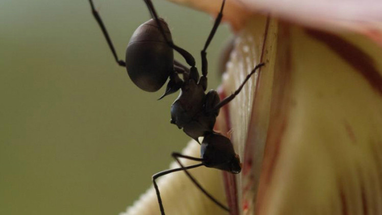 إلا أنه في الطقس المشمس الحار تجف حافة البوق وتصبح آمنة لسير النمل. تمثل آحاد النمل فرقا استكشافية في خدمة مستعمرات وتتولى أعمال استطلاع وجمع الرحيق من الفخ قبل أن يقفل لتخبر أقرانها بمكان وجود هذا الرحيق الشهي. ثم تسير أسراب النمل نحو الفخ غافلة ليتم الإيقاع بها.