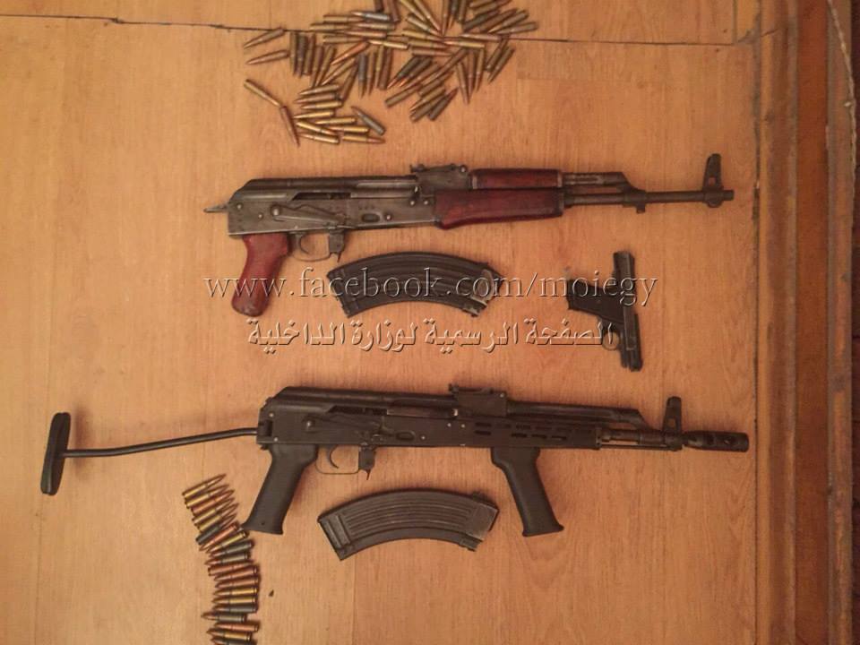 تم التعامل الفورى مع تلك المعلومات وتحديد وضبط هؤلاء العناصر وهم (صهيب محمود عطا الله محمودى – حمدى أحمد على محمد- هيثم محمد محمود بيومى- أحمد خليفة زكى أحمد – أنس محمد نور الدين عبدو – جمال الدين محمد عبدالعزيز – على على حسين على حسين- أسامه قدرى عبدالرحمن إبراهيم-محمود حسين رشاد حسين- وليد حسين رشاد حسين- محمد عبدالعال على عبدالعال) وعثر بحوزتهم على (5 بنادق آلية، بندقية خرطوش، 9 فرد خرطوش، 12 خزينة آلية، 871 طلقة آلى، 49 طلقة خرطوش) بالإضافة لوثائق تنظيمية على إستراتيجية التنظيم لتنفيذ العمليات العدائية .